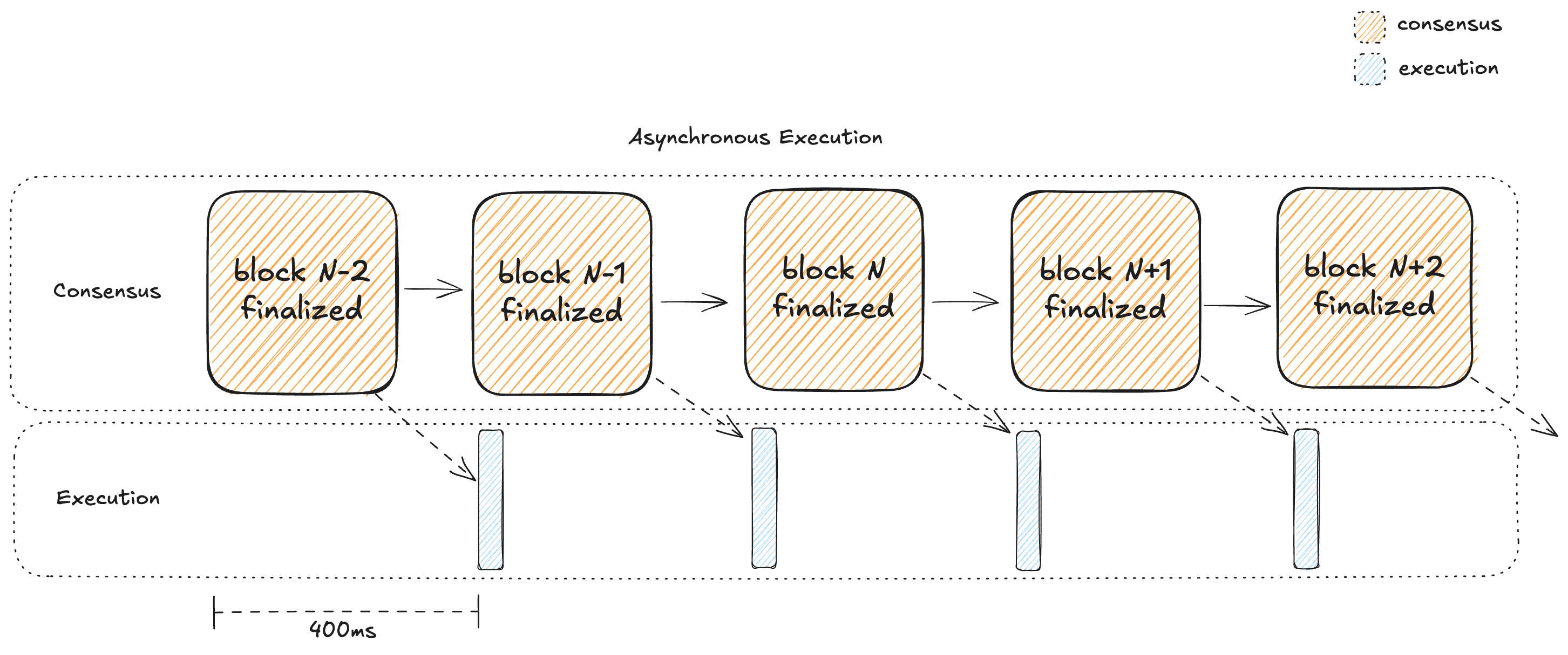 In asynchronous execution, consensus occupies the full block time - and so does execution, because they are occurring in separate swim lanes, at the same time:
