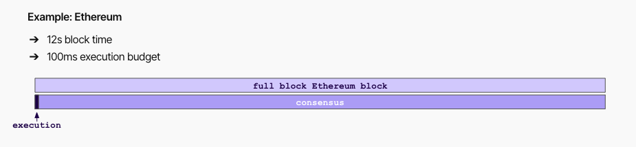 We refer to this style of blockchain as one that has execution interleaved with consensus. In this paradigm, the time budget for execution is extremely limited, since it has to happen twice and leave enough time for multiple rounds of cross-globe communication for consensus.