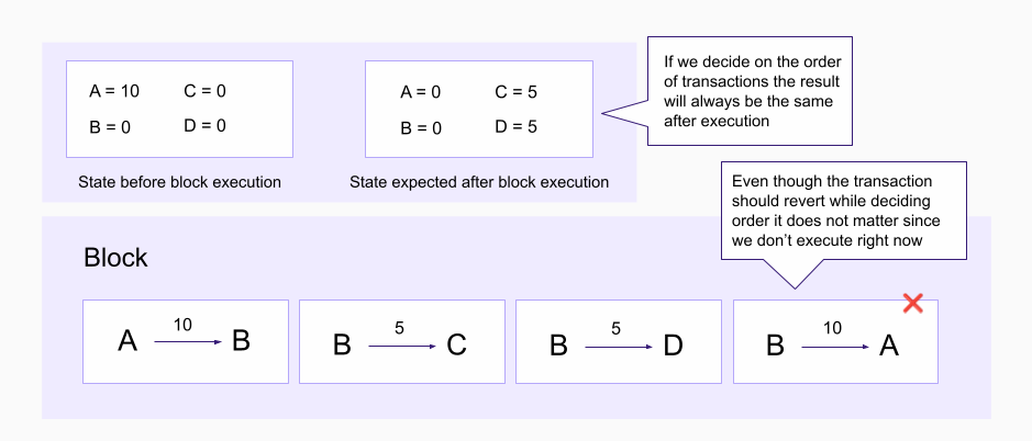 That is, the leader proposes an ordering without knowing the resultant state root, and the validating nodes vote on block validity without knowing (for example) whether all of the transactions in the block execute without reverting.